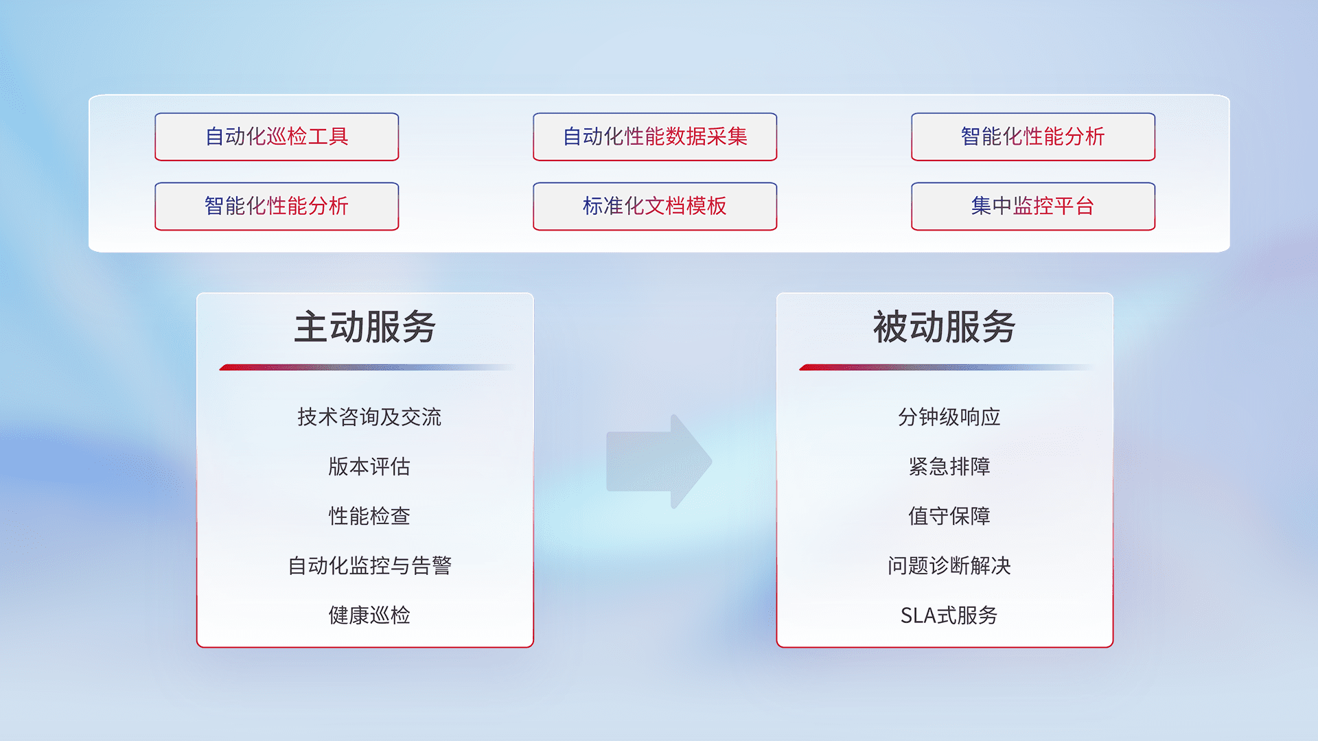 智能化工具和标准化文档,,保障服务质量,,,提供主动服务(包含技术咨询、、版本评估、、、、性能检查、、自动化监控与告警、、、、健康巡检)和被动服务包含(分钟级响应、、、、紧急排障、、、值守保障、、问题诊断解决、、、SLA服务)。。